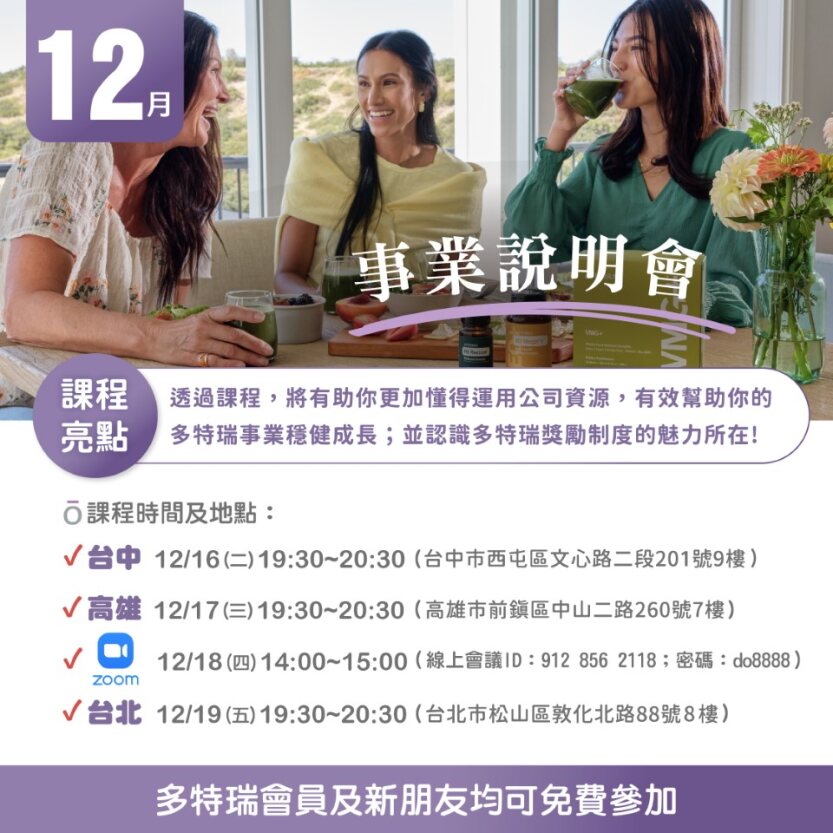 12月,我們規劃北、中、南及線上的事業說明會,從「愛用」到「經營」,啟動您的健康事業!邀請您預留時間邀約夥伴一起來參與這個改變的契機!事業說明會時間: