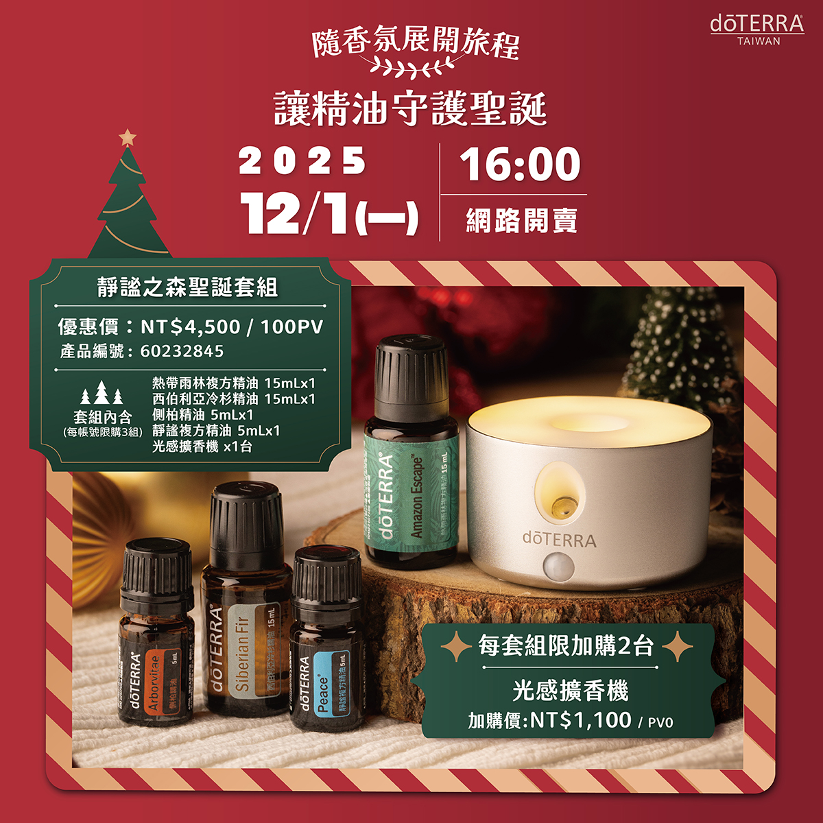 「靜謐之森聖誕套組」將於 12/1(一) 16:00 網路限量開賣。套組內含熱帶雨林複方、西伯利亞冷杉、側柏精油、靜謐複方精油等珍貴精油,與時尚光感擴香機,每帳號限購 3 組,每套組並享加購 2 台光感擴香機機會,數量有限,售完為止!請把握機會,用靜謐氣息,為您的居家空間注入節慶的療癒氛圍!