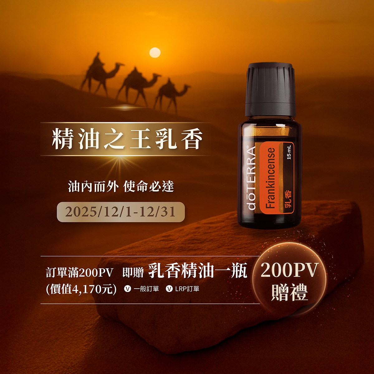 十二月「200PV 獻禮」震撼登場!2025/12/1~12/31 期間,凡單筆訂單滿 200PV,即贈價值 $4,170 元乳香精油 15mL 一瓶!當寒冬來臨,身心渴望穩定力量,「精油之王」乳香正是最佳後盾—深沉、溫暖、靜謐。無論是早晨專注或夜晚放鬆,乳香都能陪您找回能量與平衡。把握機會,將這份珍貴的大地禮物免費帶回家!