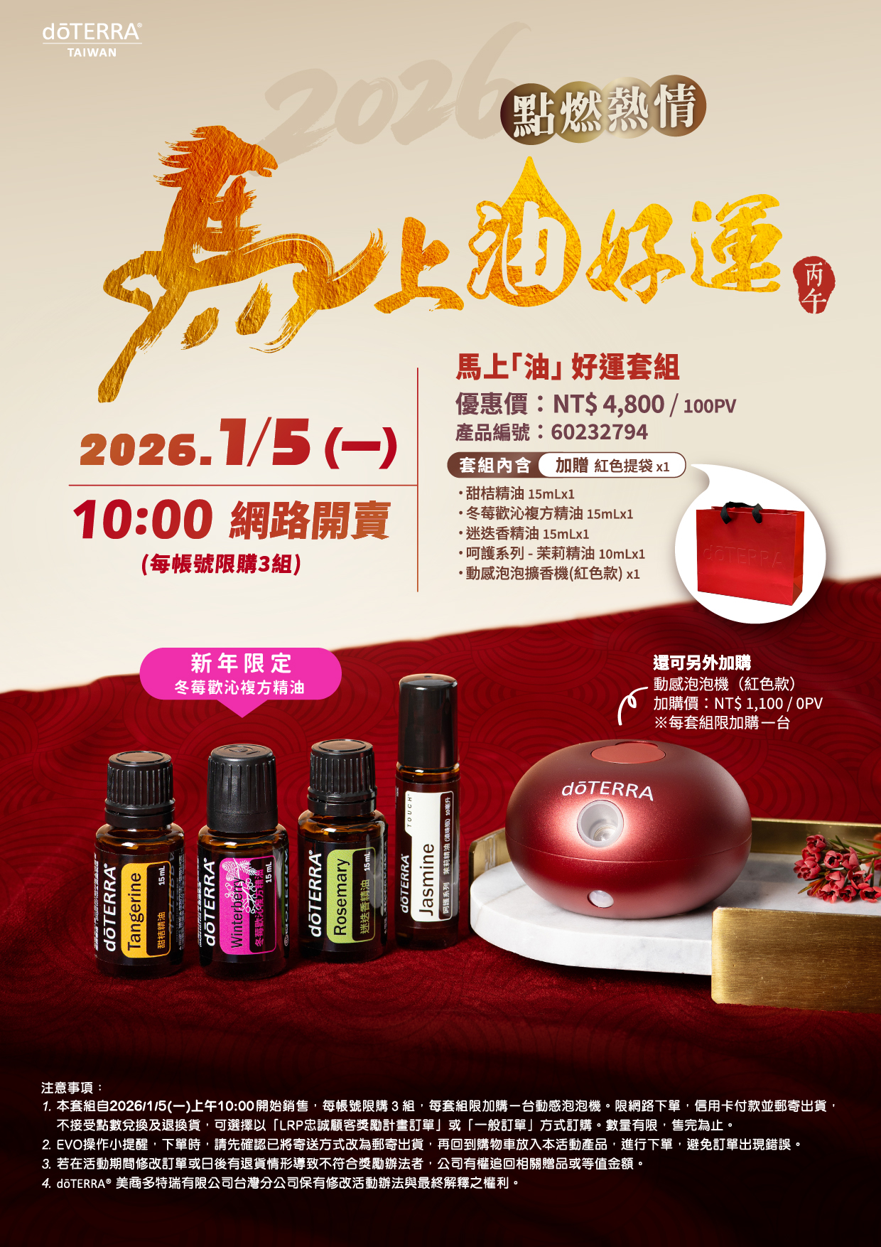 迎接馬年,把好運搶先送給你。2026「馬上油好運」新年限定套組,將於 2025/1/5(一)上午 10:00 於網路正式開賣。套組內含冬莓歡沁複方 15mL 、迷迭香 15mL 、呵護系列茉莉精油 10mL與甜桔 15mL 各一瓶以及動感泡泡擴香機(紅色款),搭配限量新年優惠加贈紅色提袋,送禮或自用都相當合適,數量有限,錯過就買不到了。