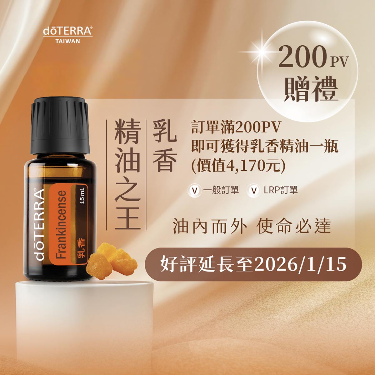 一滴乳香精油,可以帶給世界什麼樣的影響?在朋友手心滴上一滴乳香精油,精油的香氣,讓他變得更快樂。但,乳香精油的影響,並不僅限於此,他使命必達,讓人們油內而外都被療癒!2026/1/1~2026/1/15,凡單張訂單滿200PV,即可獲得乳香精油15mL一瓶(價值4,170元)。