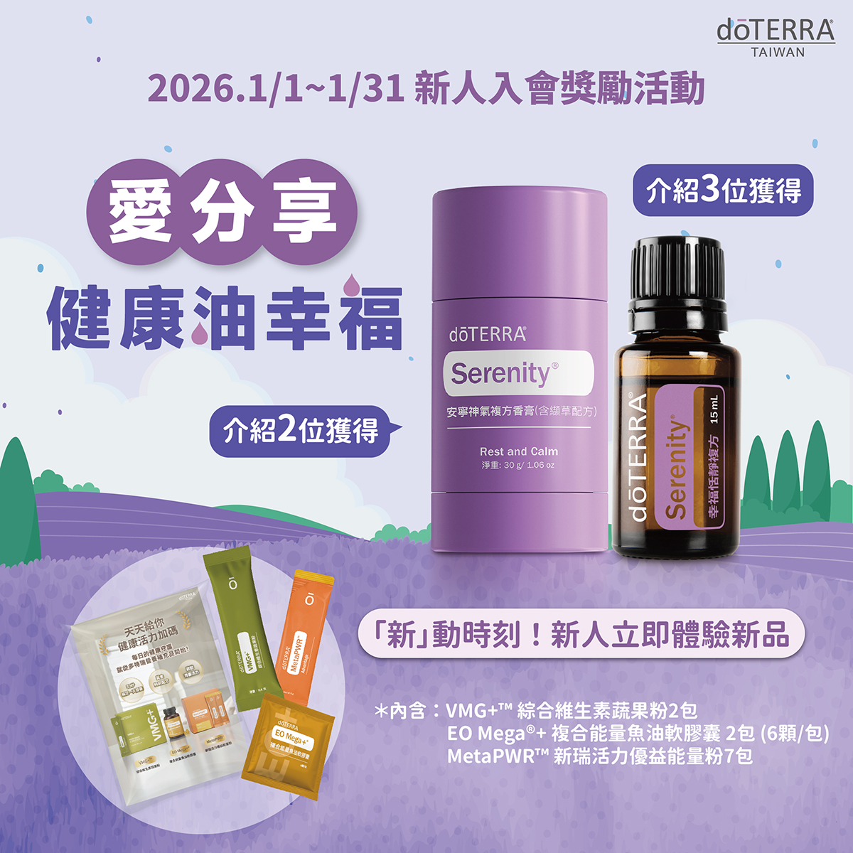 介紹人推薦 2 位新人送安寧神氣香膏,推薦 3 位(含)以上再加贈幸福恬靜精油
